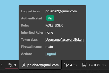 A la hora de probar que todo funcione bien, en la página web estando en modo desarrollo se nos indicara en la barra inferior si se ha iniciado sesión y con que usuario.