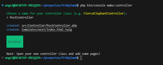 A continuación nos pedirá que ingresemos un nombre cumplido la nomenclatura que se nos indica (ej: PostController)